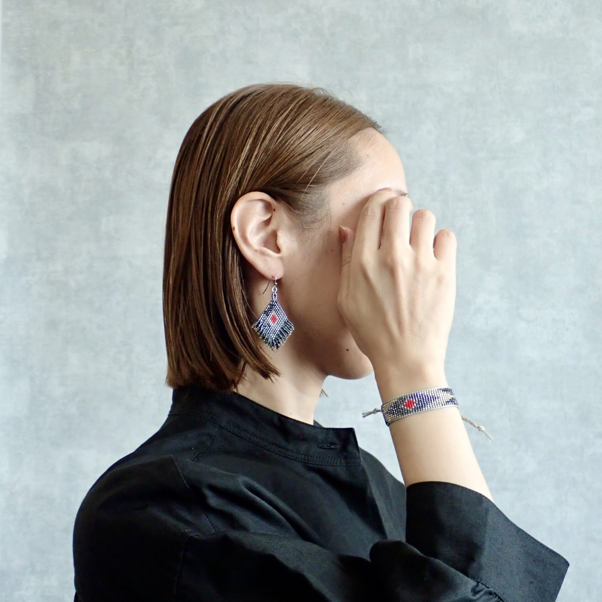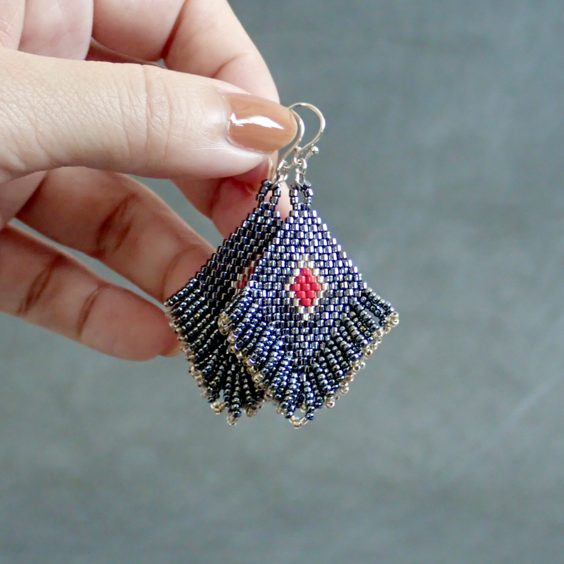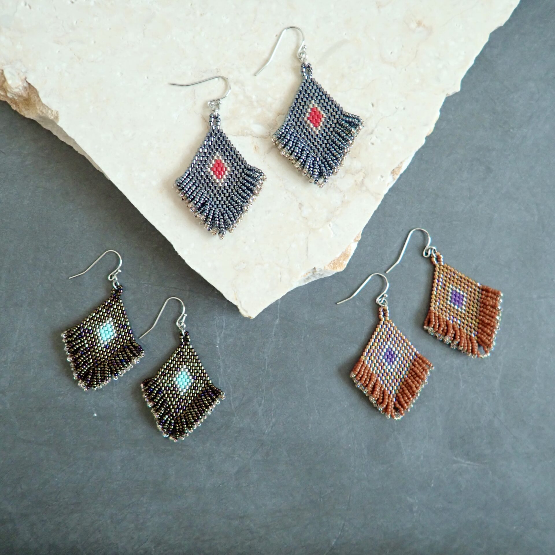 ひし形のモチーフには粒の揃った高品質なビーズを、